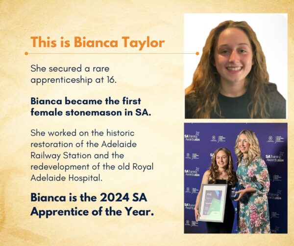 Bianca Taylor is the incredible Australian Apprentice who became South Australia’s first female stonemason when she was 16.After discovering her passion for stonemasonry at a very young age, she secured a rare apprenticeship. Over the following four years, she lent her skills to prestigious projects such as the historic restoration of Adelaide Railway Station and… Continue reading Breaking Barriers and Making History!