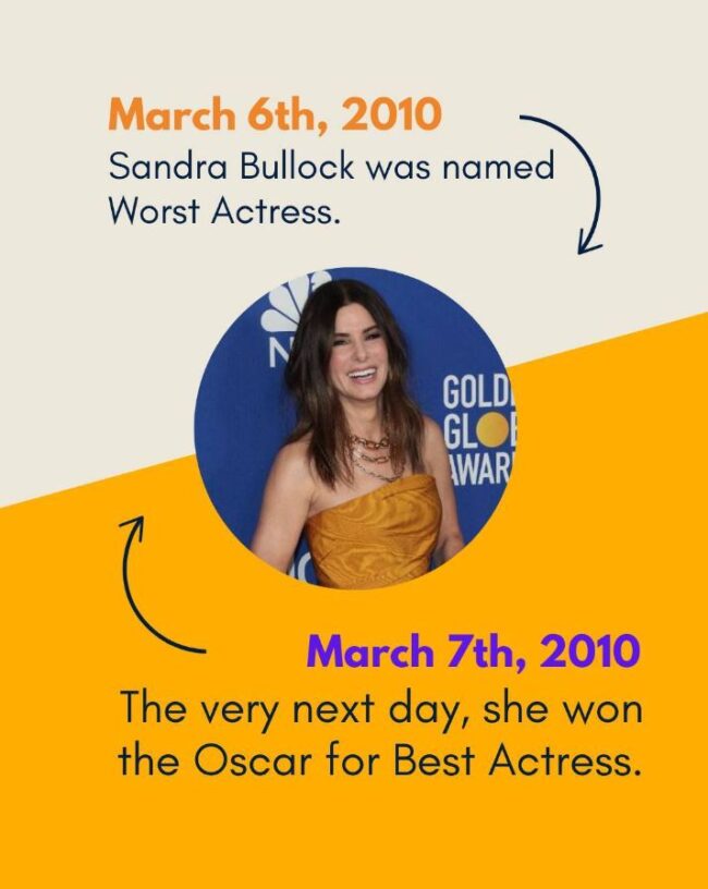 Sandra Bullock is a testament to that. In the very same weekend, she experienced both ends of the spectrum for two different films. In 2010, on a Saturday night, she accepted a Golden Raspberry Award for “Worst Actress” for her role in “All About Steve”. But the very next night, she won an Academy Award… Continue reading One Bad Result Doesn’t Decide Your Career