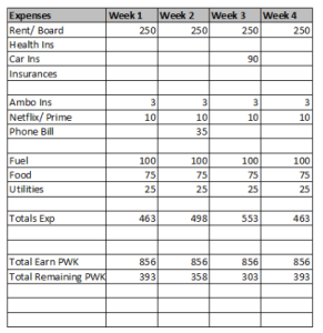 Once you’ve identified your expense types and their corresponding due dates each month, enter them into the table provided in the rough period they fall under. Take a look at the example budget table below.